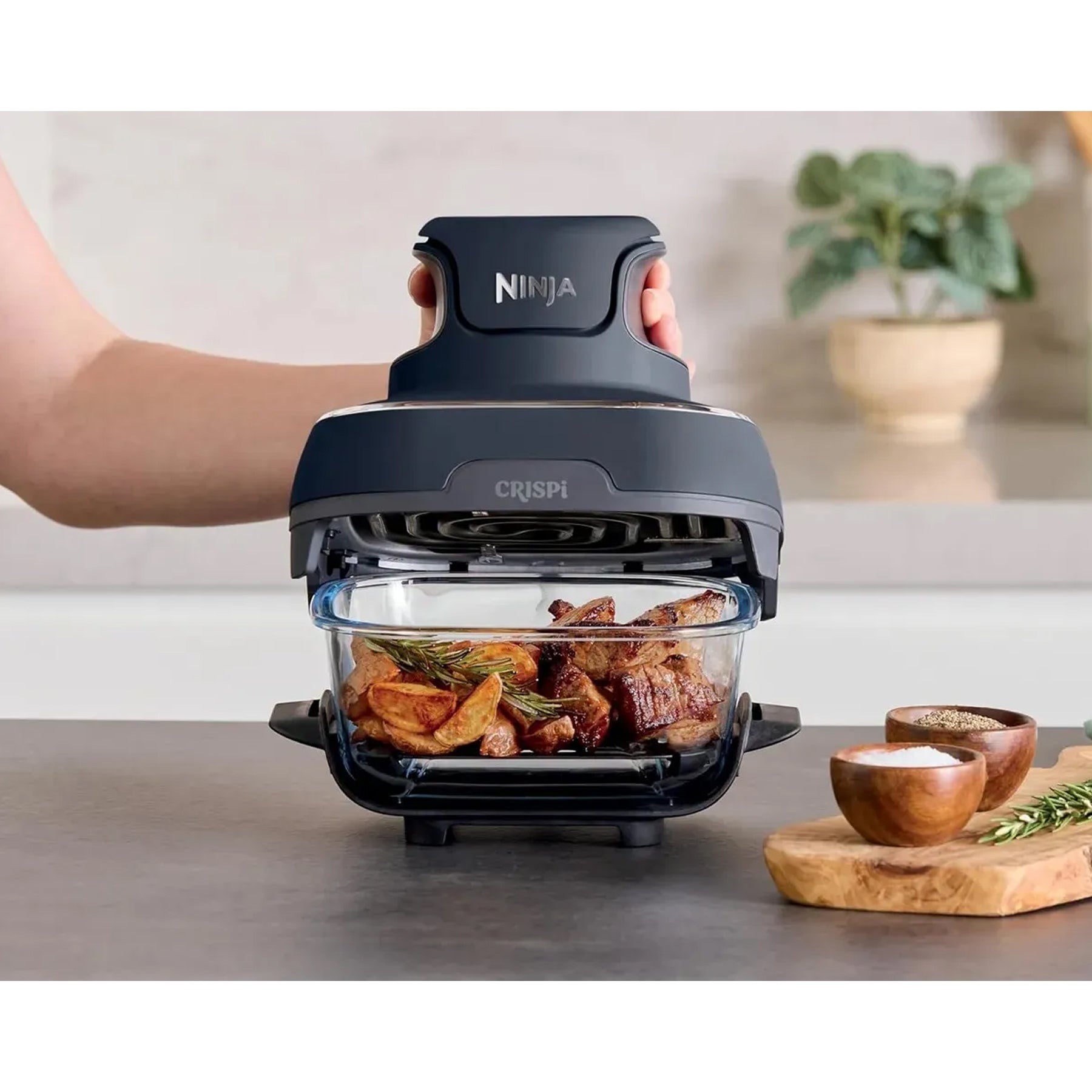 La freidora de aire Ninja Crispi 4‑en‑1 FN101GY combina el poder de una freidora de aire con la funcionalidad de un mini horno, todo en un diseño compacto, elegante y portátil. Con sus funciones de freír al aire, dorar, rostizar y recalentar, te permite preparar comidas crujientes por fuera y jugosas por dentro, en menos tiempo y con menos aceite.